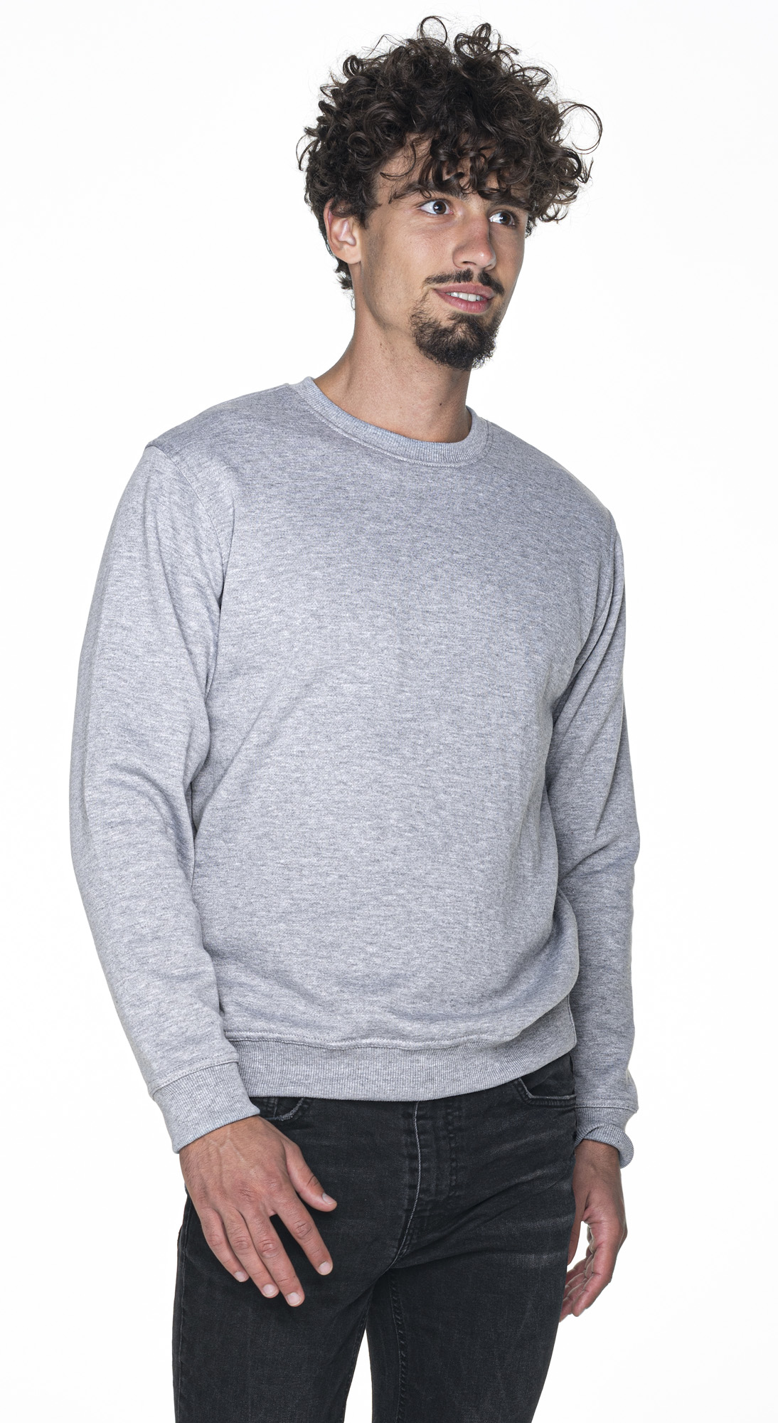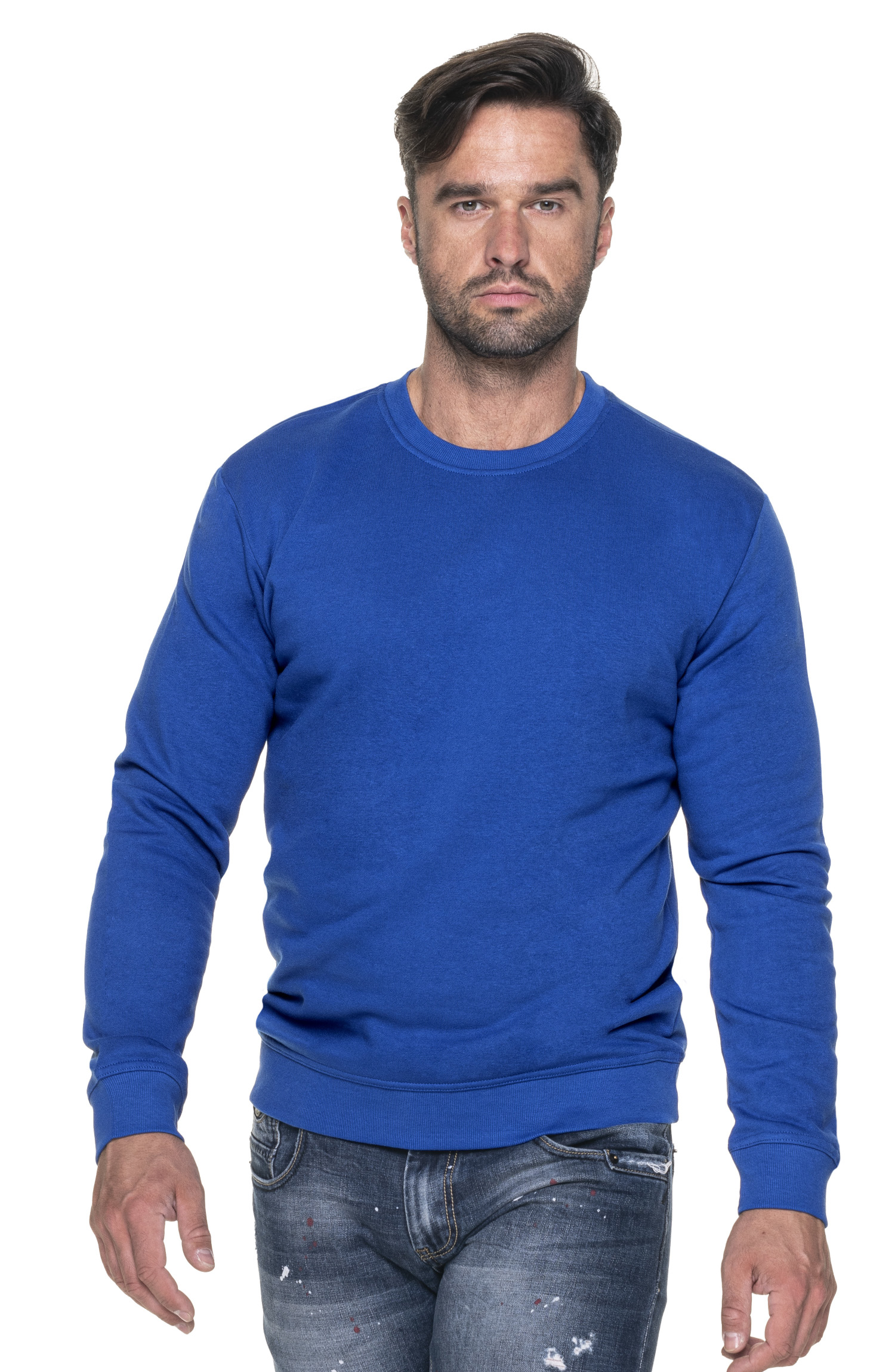 Prosta, klasyczna bluza męska wykonana z miękkiej dzianiny; materiał od wewnątrz szczotkowany; dekolt, rękawy oraz dół bluzy wykończone dwuwarstwowym ściągaczem z elastanem rib 2x2, zapewniającym dłuższą trwałość; kark i ramiona z taśmą wzmacniającą i stabilizującą, która pozytywnie wpływa na trwałość szwów; podwójne, gęste szwy do których wykorzystano nici najwyższej jakości
