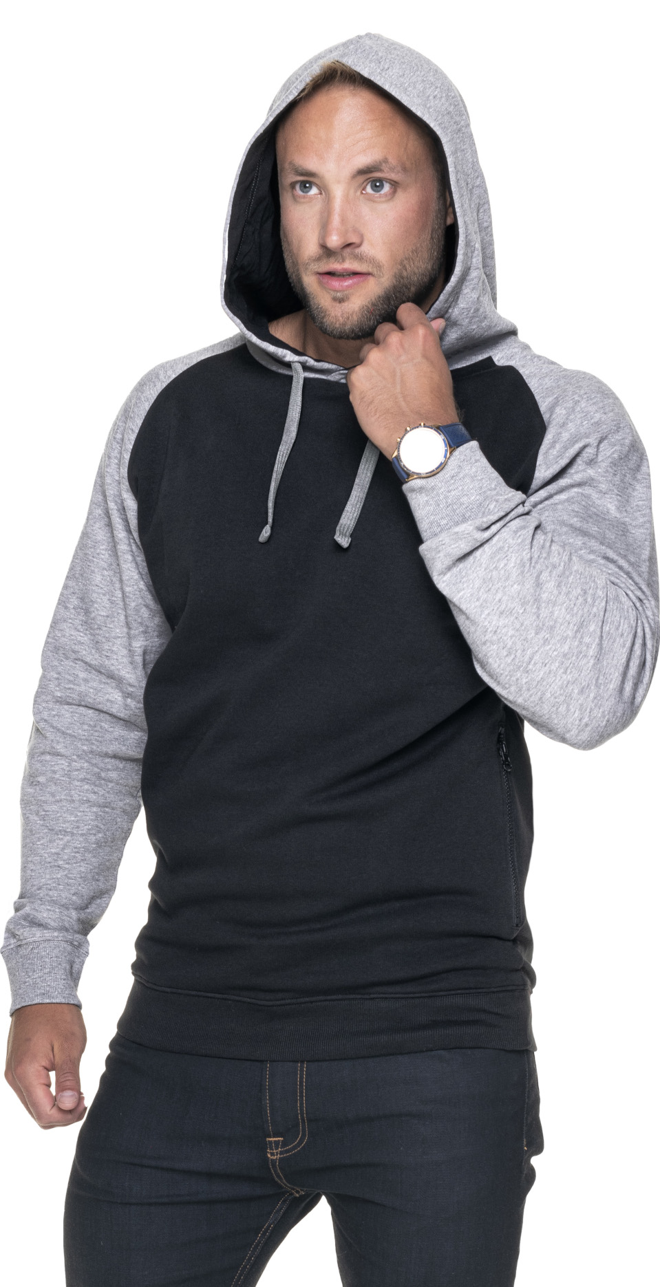 Prosta i klasyczna bluza z kapturem; miękka dzianina szczotkowana od wewnątrz; raglanowe rękawy i kaptur w kontrastowym kolorze; boczne kieszenie zamykane na plastikowy zamek kostkowy; dwuwarstwowy kaptur z regulacją na sznurek; elastyczne ściągacze; podwójne szwy; taśma wzmacniająca na karku i ramionach