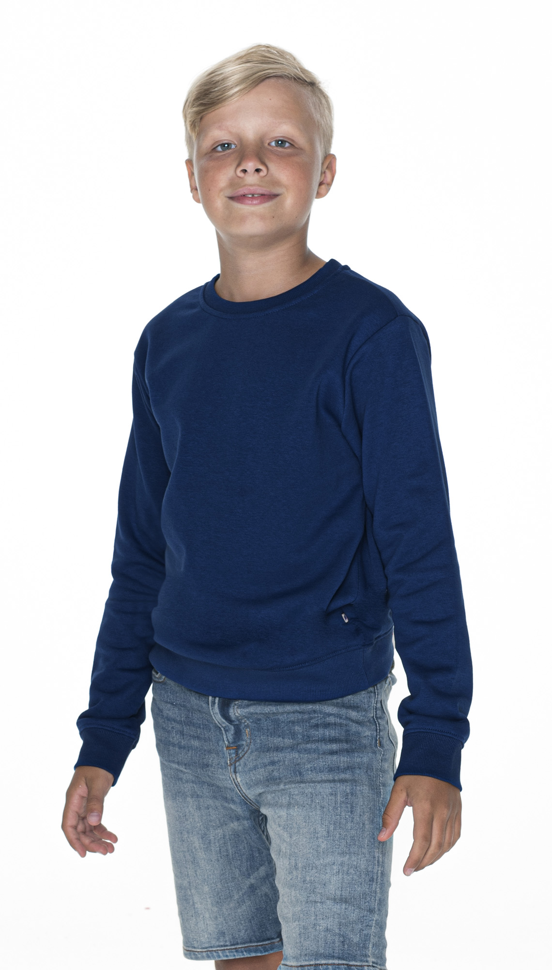 Prosta, klasyczna bluza dziecięca wykonana z miękkiej dzianiny; materiał od wewnątrz szczotkowany; dekolt, rękawy oraz dół bluzy wykończone dwuwarstwowym ściągaczem z elastanem rib 2x2, zapewniającym dłuższą trwałość; kark i ramiona z taśmą wzmacniającą i stabilizującą, która pozytywnie wpływa na trwałość szwów; podwójne, gęste szwy do których wykorzystano nici najwyższej jakości