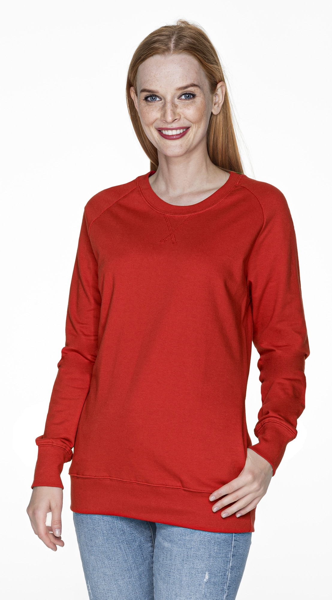Prosta, klasyczna bluza damska wykonana z dzianiny french terry; boczne kieszenie wykonane z dzianiny single jersey; dekolt, rękawy oraz dół bluzy wykończone dwuwarstwowym ściągaczem z elastanem rib 2x2, zapewniającym dłuższą trwałość; ozdobne przeszycie przy dekolcie; kark i ramiona z taśmą wzmacniającą i stabilizującą, która pozytywnie wpływa na trwałość szwów; podwójne, gęste szwy do których wykorzystano nici najwyższej jakości