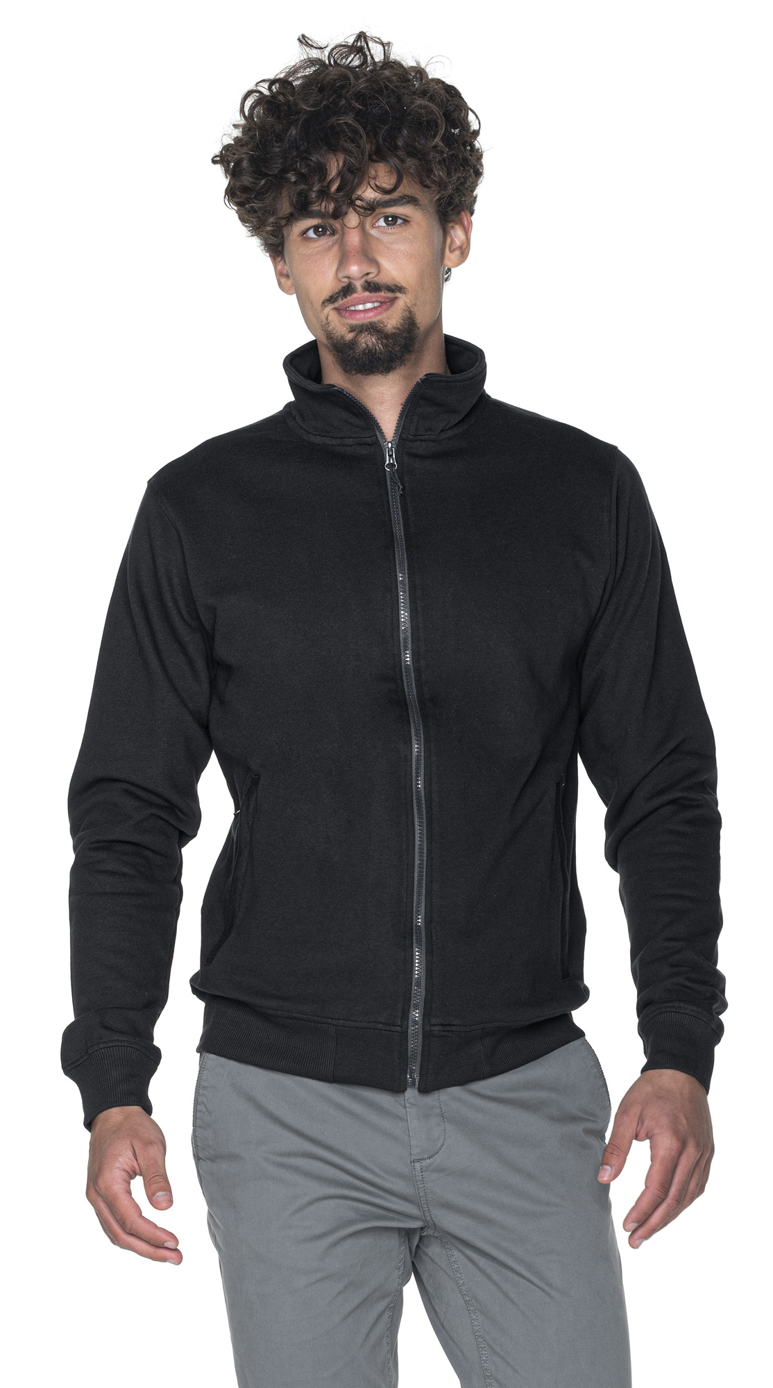 Gruba i zbita dzianina typu cross terry; stójka wykończona od wewnątrz ribem 2x2; ozdobny metalowy zamek; elastyczne ściągacze; podwójne szwy; taśma wzmacniająca na karku i ramionach