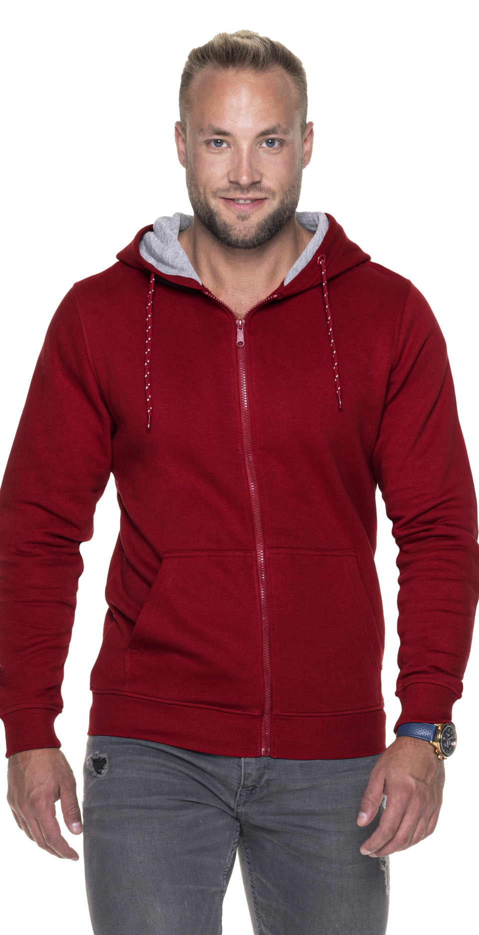Bluza męska z kapturem wykonana z lekkiej dzianiny; materiał od wewnątrz szczotkowany; wykończenie antypillingowe materiału; dwie przednie kieszenie; kaptur wyścielony kontrastowym materiałem typu waffle; regulacja kaptura ozdobnym sznurkiem; zamek główny kostkowy, plastikowy; rękawy oraz dół bluzy wykończone dwuwarstwowym ściągaczem z elastanem rib 2x2, zapewniającym dłuższą trwałość; szyja i ramiona z taśmą wzmacniającą i stabilizującą, która pozytywnie wpływa na trwałość szwów; podwójne, gęste szwy do których wykorzystano nici najwyższej jakości