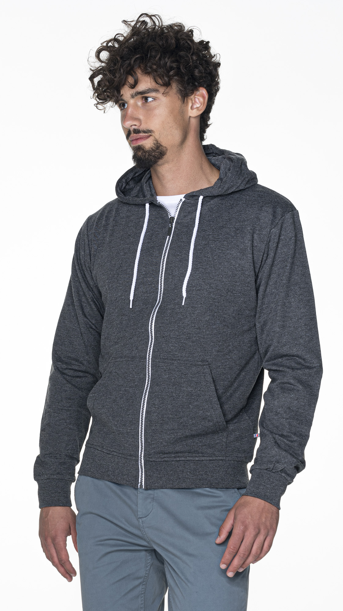 Bluza męska z kapturem wykonana z lekkiej dzianiny french terry; dwie przednie kieszenie; kaptur wyścielony materiałem single jersey; regulacja kaptura ozdobnym sznurkiem; zamek główny kostkowy, plastikowy na kontrastowej taśmie; rękawy oraz dół bluzy wykończone dwuwarstwowym ściągaczem z elastanem rib 2x2, zapewniającym dłuższą trwałość; szyja i ramiona z taśmą wzmacniającą i stabilizującą, która pozytywnie wpływa na trwałość szwów; podwójne, gęste szwy do których wykorzystano nici najwyższej jakości