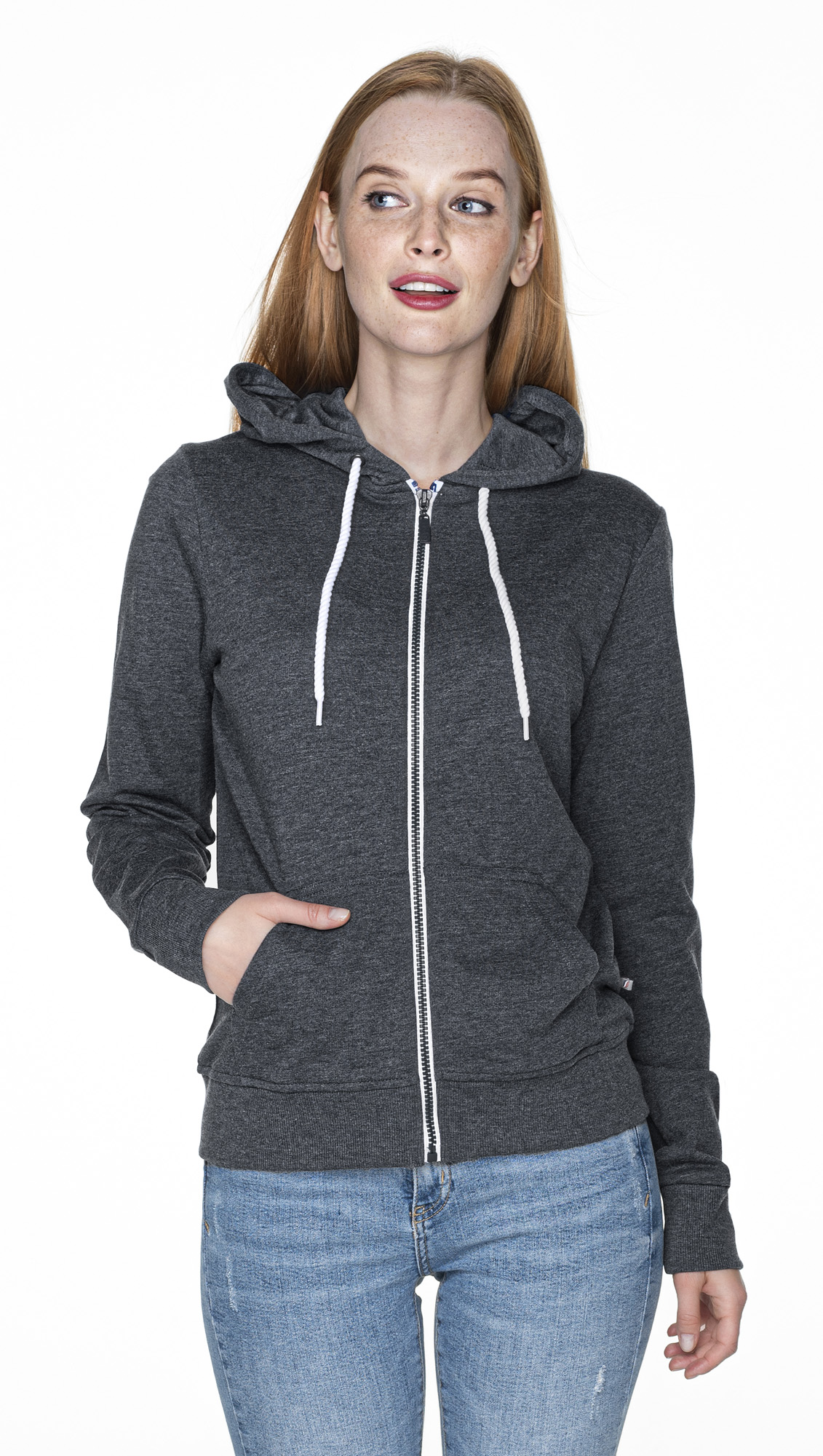 Bluza damska z kapturem wykonana z lekkiej dzianiny french terry; dwie przednie kieszenie; kaptur wyścielony materiałem single jersey; regulacja kaptura ozdobnym sznurkiem; zamek główny kostkowy, plastikowy na kontrastowej taśmie; rękawy oraz dół bluzy wykończone dwuwarstwowym ściągaczem z elastanem rib 2x2, zapewniającym dłuższą trwałość; szyja i ramiona z taśmą wzmacniającą i stabilizującą, która pozytywnie wpływa na trwałość szwów; podwójne, gęste szwy do których wykorzystano nici najwyższej jakości