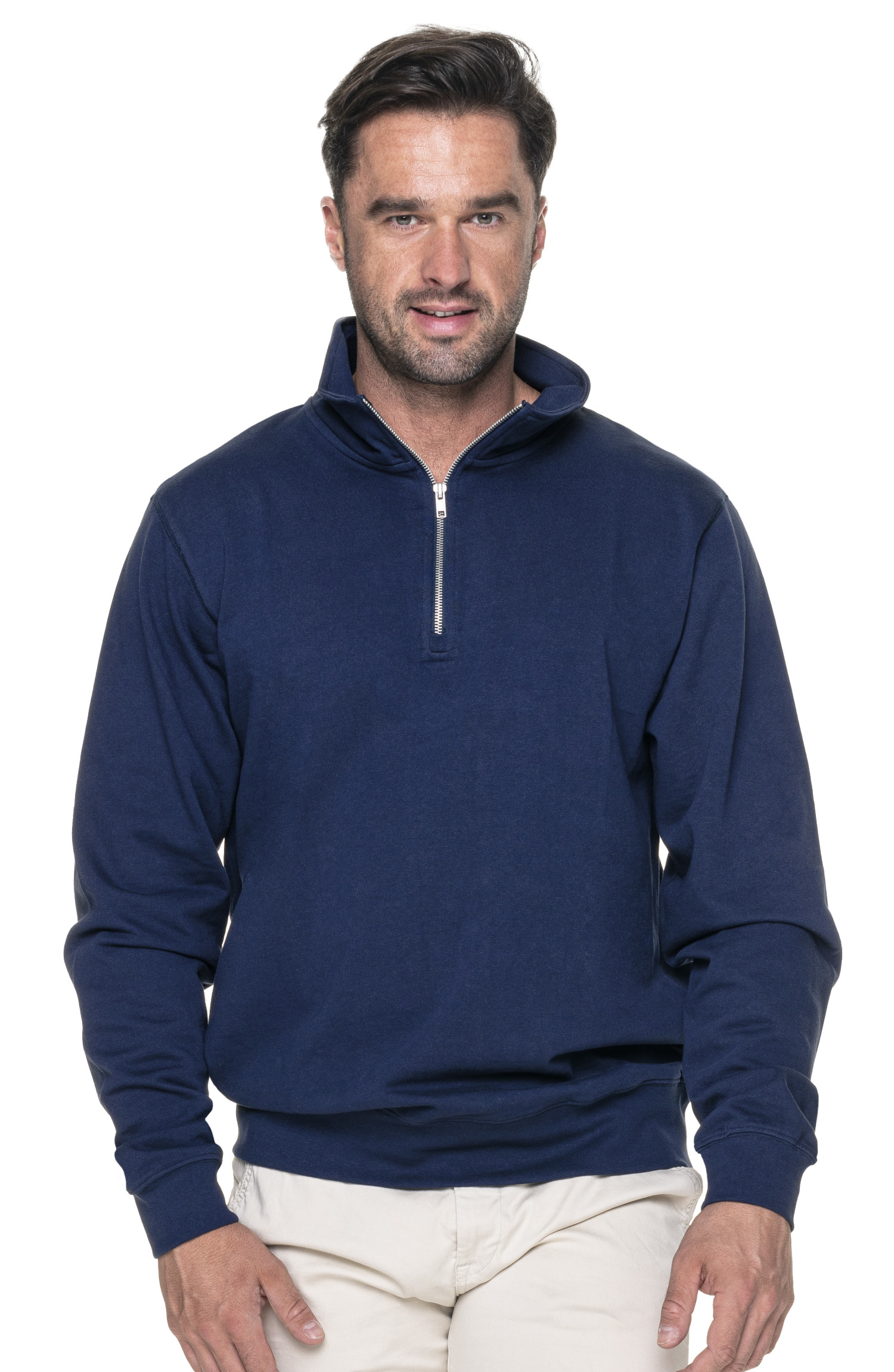 Bluza męska wykonana z miękkiej dzianiny; gruby materiał od wewnątrz szczotkowany; kołnierz ze stójką; rozpięcie kołnierza na krótki plastikowy zamek kostkowy; raglanowe rękawy; rękawy oraz dół bluzy wykończone dwuwarstwowym ściągaczem z elastanem rib 2x2, zapewniającym dłuższą trwałość; szyja i ramiona z taśmą wzmacniającą i stabilizującą, która pozytywnie wpływa na trwałość szwów; podwójne, gęste szwy do których wykorzystano nici najwyższej jakości