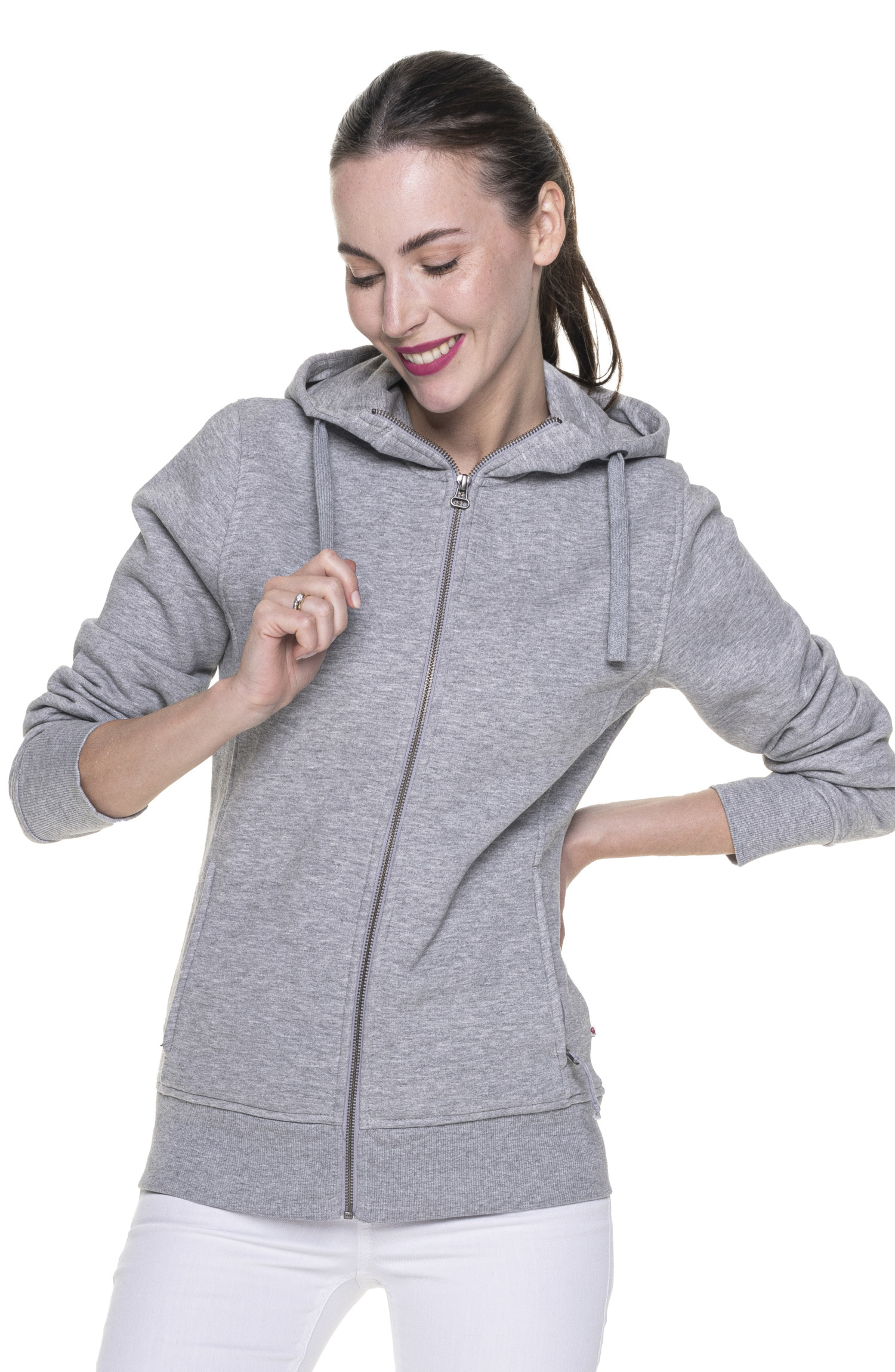 Bluza damska z kapturem wykonana z miękkiej dzianiny; gruby materiał od wewnątrz szczotkowany; kaptur wyścielony materiałem single jersey; regulacja kaptura na sznurek; zamek główny metalowy YKK; dwie, przednie kieszenie zamykane na zamek nylonowy YKK; rękawy oraz dół bluzy wykończone dwuwarstwowym ściągaczem z elastanem rib 2x2, zapewniającym dłuższą trwałość; szyja i ramiona z taśmą wzmacniającą i stabilizującą, która pozytywnie wpływa na trwałość szwów; podwójne, gęste szwy do których wykorzystano nici najwyższej jakości